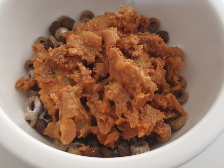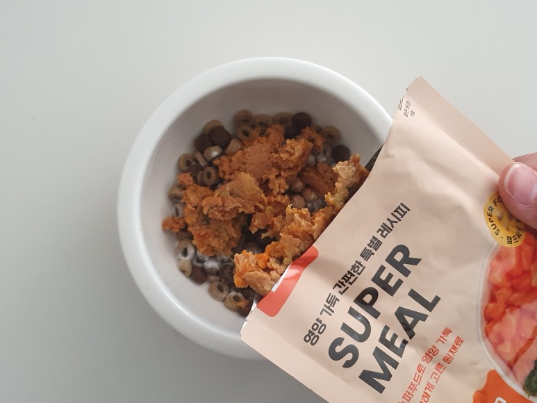 평소보다 적은 비용으로 사료에 슈퍼밀을 추가할 것입니다! 슈퍼밀은 네모난 스팸처럼 생겼는데 토핑으로 얹어볼까 해서 포장된 상태로 손으로 으깨어 주었습니다. 이 상태에서 다시 전자레인지에 20초 정도 돌려주면 맛과 향이 더 맛있어집니다.
