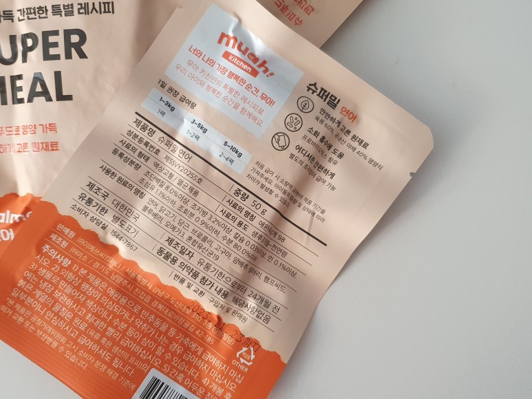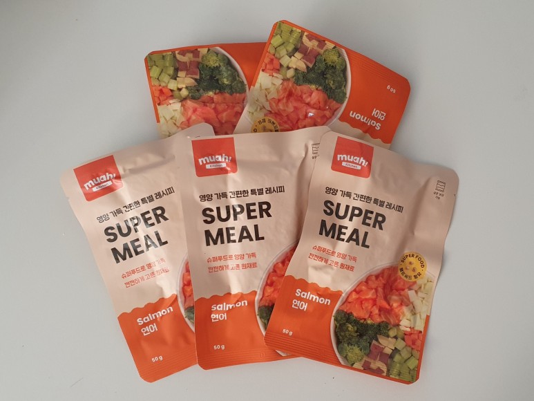 생후 3개월 이후부터 결제가 가능하며 종류는 연어, 쇠고기, 칠면조 맛있어요. 사람을 위한 슈퍼푸드로 채워진 슈퍼밀. 각 팩의 무게는 50g으로 캠핑이나 외출 시 휴대하고 비용을 지불하기에 완벽한 크기입니다. 우리 더스트가 먹은 것은 연어맛인데 연어, 닭고기, 당근, 브로콜리, 고구마, 양배추, 셀러리, 대마씨, 블루베리, 오메가3, 혼합유산균19 등의 재료가 가득 들어있습니다. 연어맛은 연어만 들어가는게 아니라 연어가 주재료! 추가로 치킨도 추가됩니다.