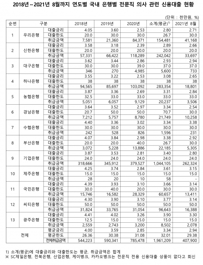 일반적으로 시중은행은 소득이 안정된 직업을 가진 사람들을 대상으로 특별한 금리를 적용하고 있습니다! 이런 전문직 대출도 자세히 살펴보면 같은 직업이라도 적용되는 대출 한도나 금리 등이 다릅니다. 의사자격증이있다해도직종,근무형태,전문의여부에따라서다달라지는거죠.아무리 경기가 어려워 의사들이 폐업, 부실 등이 늘고 있다지만 일반인들에 비해서는 낮아서 두 팔 벌려 환영하는 실정입니다.