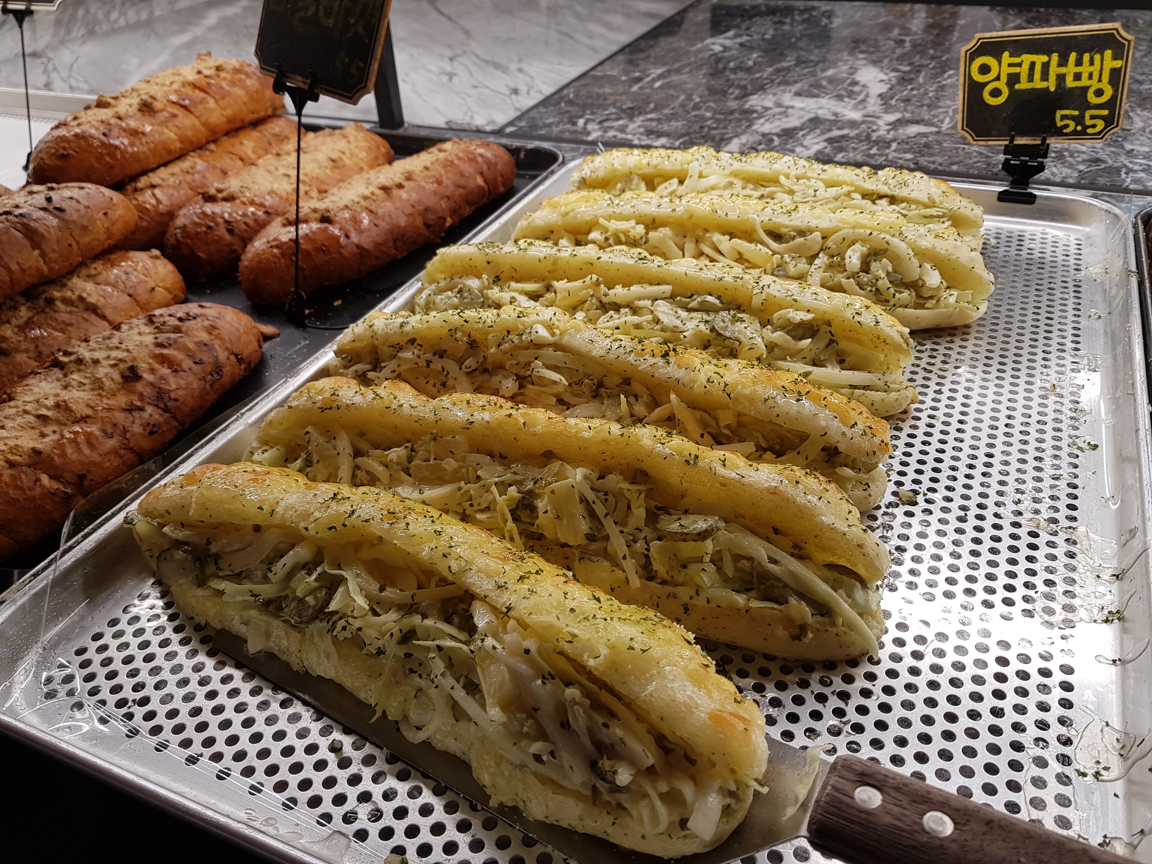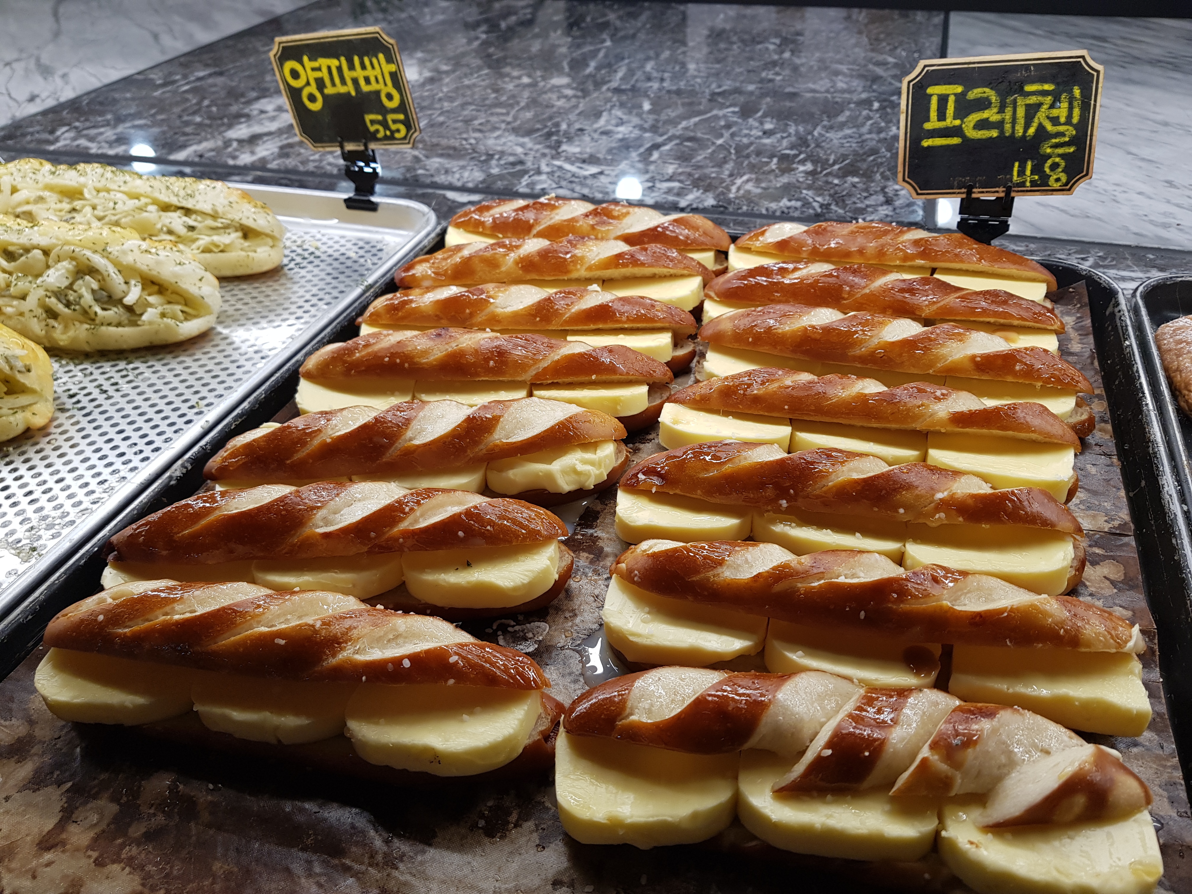양파빵이 맛있어 보여서 그 앞에 섰을 때 옆에 있는 프레첼의 버터 같은 두께를 보고 깜짝 놀랐습니다. ㅎㅎ 정말 재료 아끼지 않는 곳이네요.
