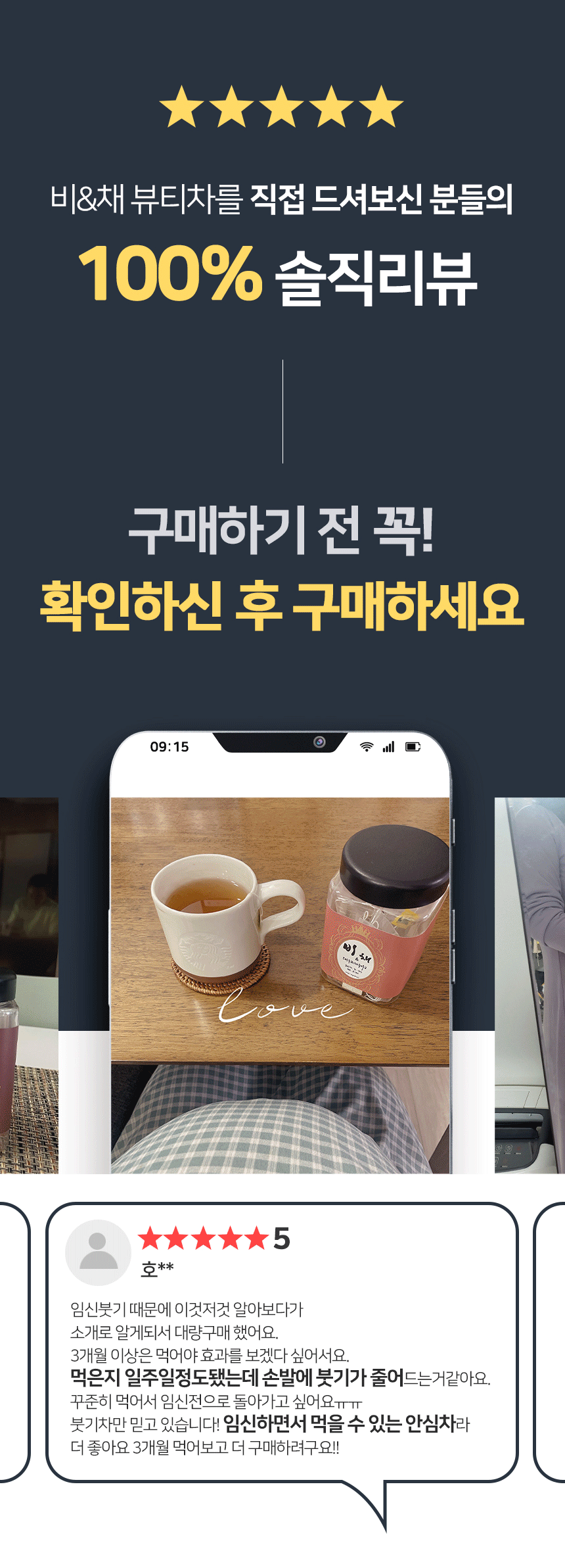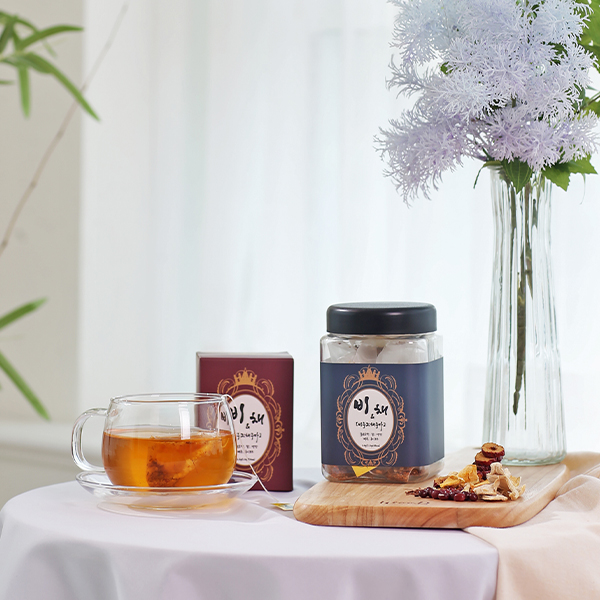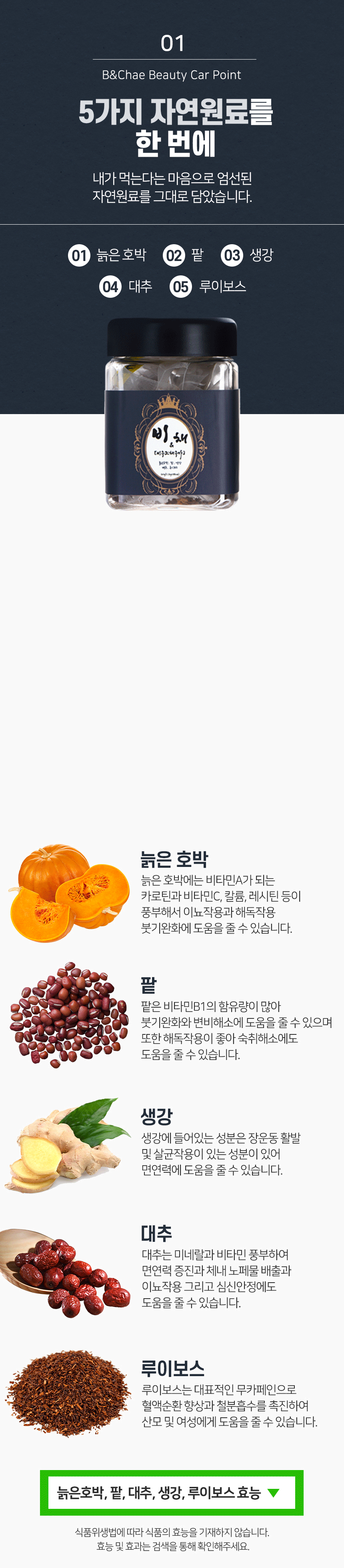 묵은 호박, 생강, 팥, 대추, 루이보스 등 5가지 천연재료로 만들었다고 한다. 각 성분의 장단점을 분석하여 균형잡힌 차로 만들었더니 붓기도 빠지고 몸도 많이 좋아진 것 같아요.