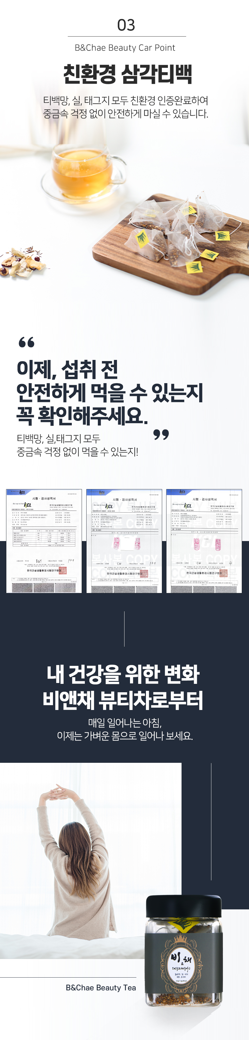비앤채프리 호생팥대루는 친환경 삼각 티백을 사용하고 있으며, 티백망, 실, 인감지 모두 친환경 소재로 중금속 걱정은 하지 않으셔도 됩니다.