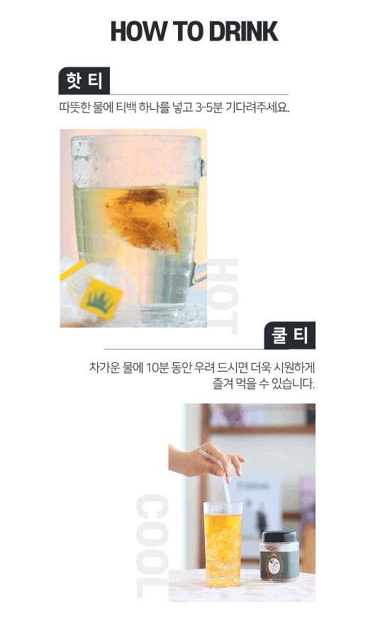 티백이라 언제 어디서나 간편하게 즐길 수 있습니다. 저는 식후에 마시고 와이프는 운동후에 마시는데 개인적으로 맛있고 부담스럽지 않아서 좋다고 생각합니다.