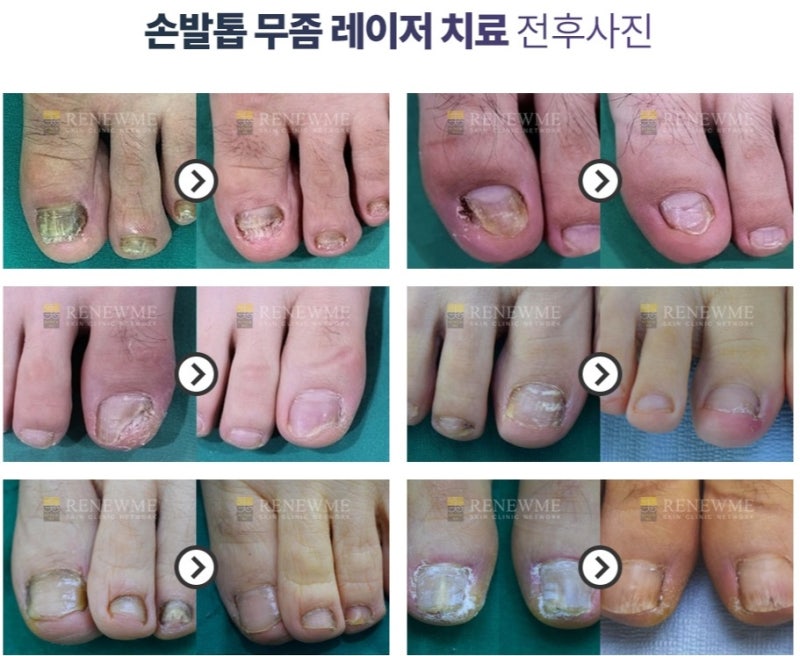 손톱무좀치료전손톱무좀,실제후기치료전모습입니다.위 환자의 경우 엄지발가락의 50% 이상이 이미 무좀균에 의해 손톱이 사라진 상태였습니다.다른 발가락도 상태가 좋지 않았어요.이처럼 손톱의 변형, 손상이 심한 경우 일반적인 약이나 연고만으로는 치료가 어렵습니다.루눌라, 핀포인트, 오니코 등의 레이저 치료를 실시하거나 2개 이상의 복합 치료를 통해 실시해야 합니다.