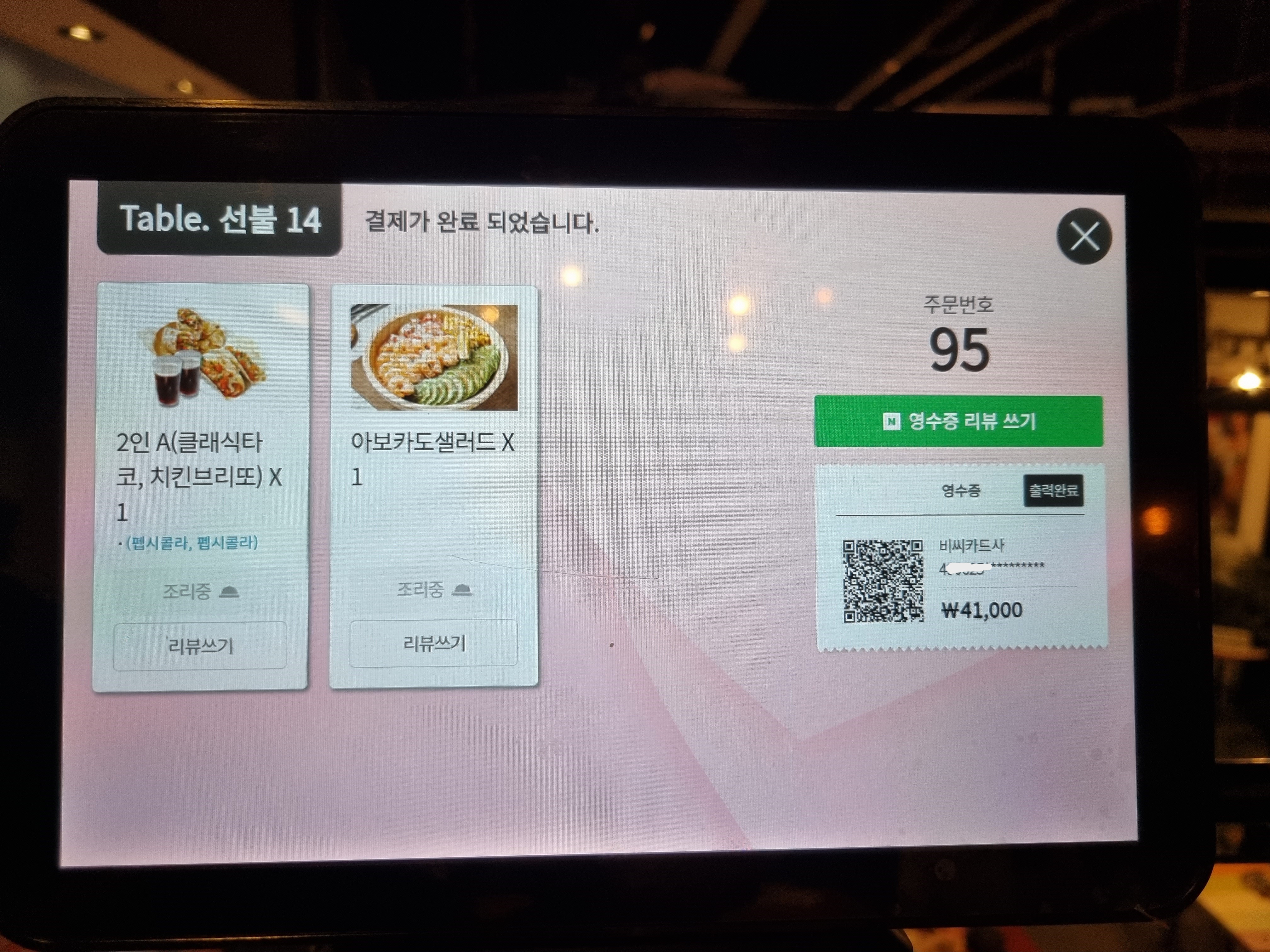 우리는 타코, 브리또, 음료가 포함된 A세트 2인(24,000원)을 주문했다.