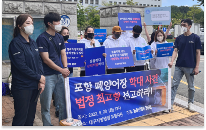 대구고등법원에서 포항 폐양어장 학대 사건 2심 첫 공판이 있었습니다.
